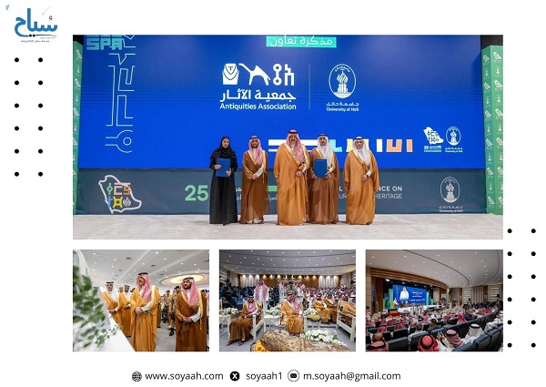 كما شهد سموه اتفاقية تعاون بين جامعة حائل ومثّلها في التوقيع عميد كلية الآداب والفنون الدكتور بشير بن علي اللويش، وجمعية الآثار ومثّلها الرئيس التنفيذي للجمعية أريج بنت ناصر الشهري، إذ تهدف إلى تزويد الجمعية بالمصادر العلمية والإلكترونية المتاحة لتعزيز مكتبتها الرقمية، بما يدعم البحث العلمي والتثقيف في مجالات السياحة والآثار، وإتاحة تبادل المعلومات والبيانات البحثية بين الطرفين بما يخدم الدراسات والبحوث، مع الالتزام بالأنظمة والتعليمات ذات العلاقة بحماية البيانات والخصوصية، وإعداد وتنفيذ ورش عمل ودورات تدريبية متخصصة تهدف إلى تطوير مهارات منسوبي الجمعية والمهتمين بمجال الآثار والتراث الثقافي، وكذلك تبادل الدعوات للمشاركة في المؤتمرات والندوات والأنشطة العلمية والثقافية ذات الاهتمام المشترك لتعزيز التواصل والشراكة، والمساهمة الفعالة في إعداد وتنفيذ الدراسات والمبادرات البحثية المشتركة التي تخدم التنمية العلمية والاجتماعية في مجال السياحة والآثار، إضافة إلى تنفيذ المبادرات والأنشطة المشتركة في المناسبات الرسمية؛ بهدف إبراز أهمية التراث الثقافي وتعزيز الوعي المجتمعي، والتنسيق والتعاون مع الجهات ذات العلاقة بالآثار بهدف توحيد الجهود ودعم المشاريع المشتركة المتعلقة بالمسح والتنقيب والحفاظ على الآثار والاشتراك في تنفيذ المشاريع.